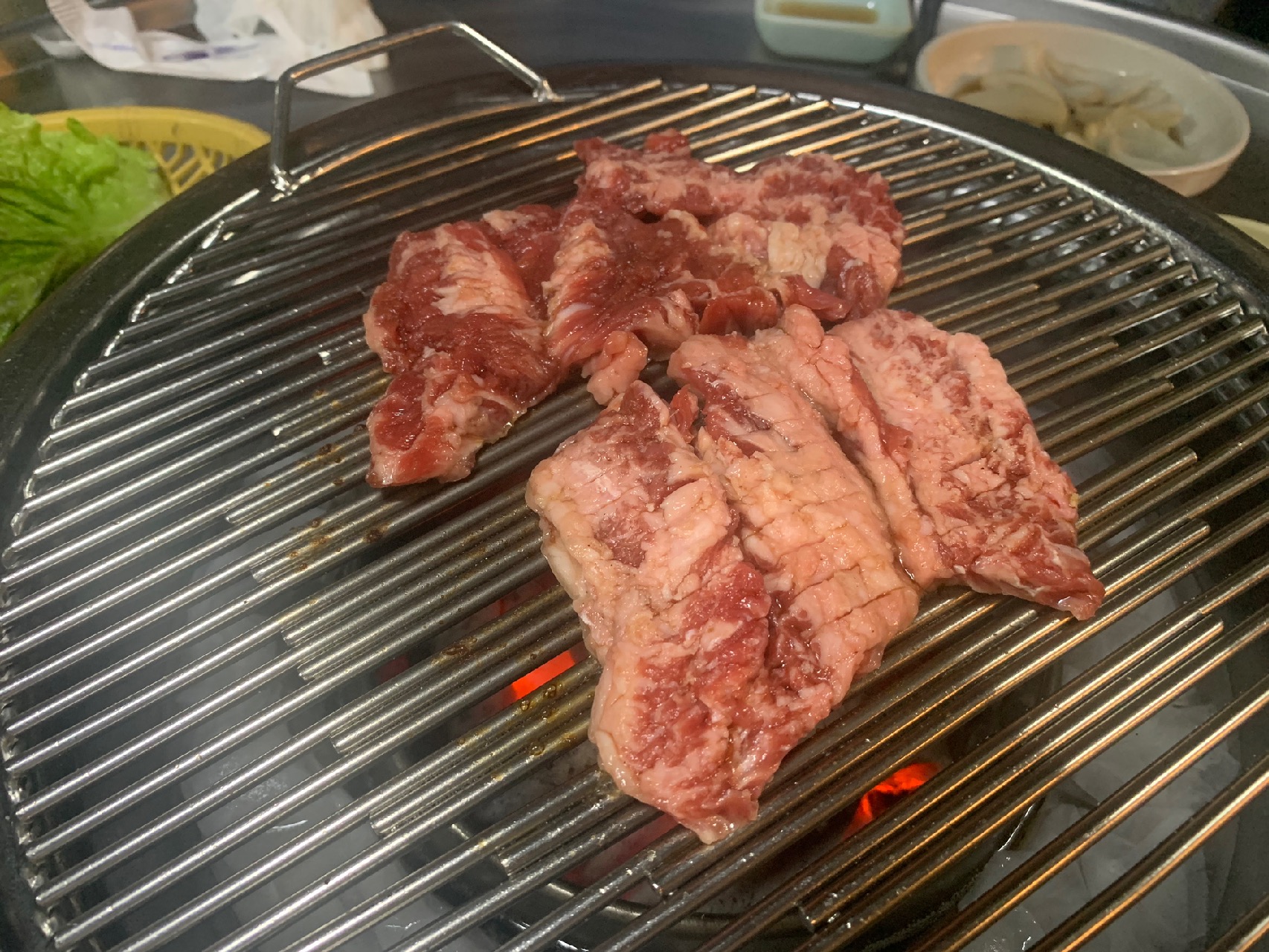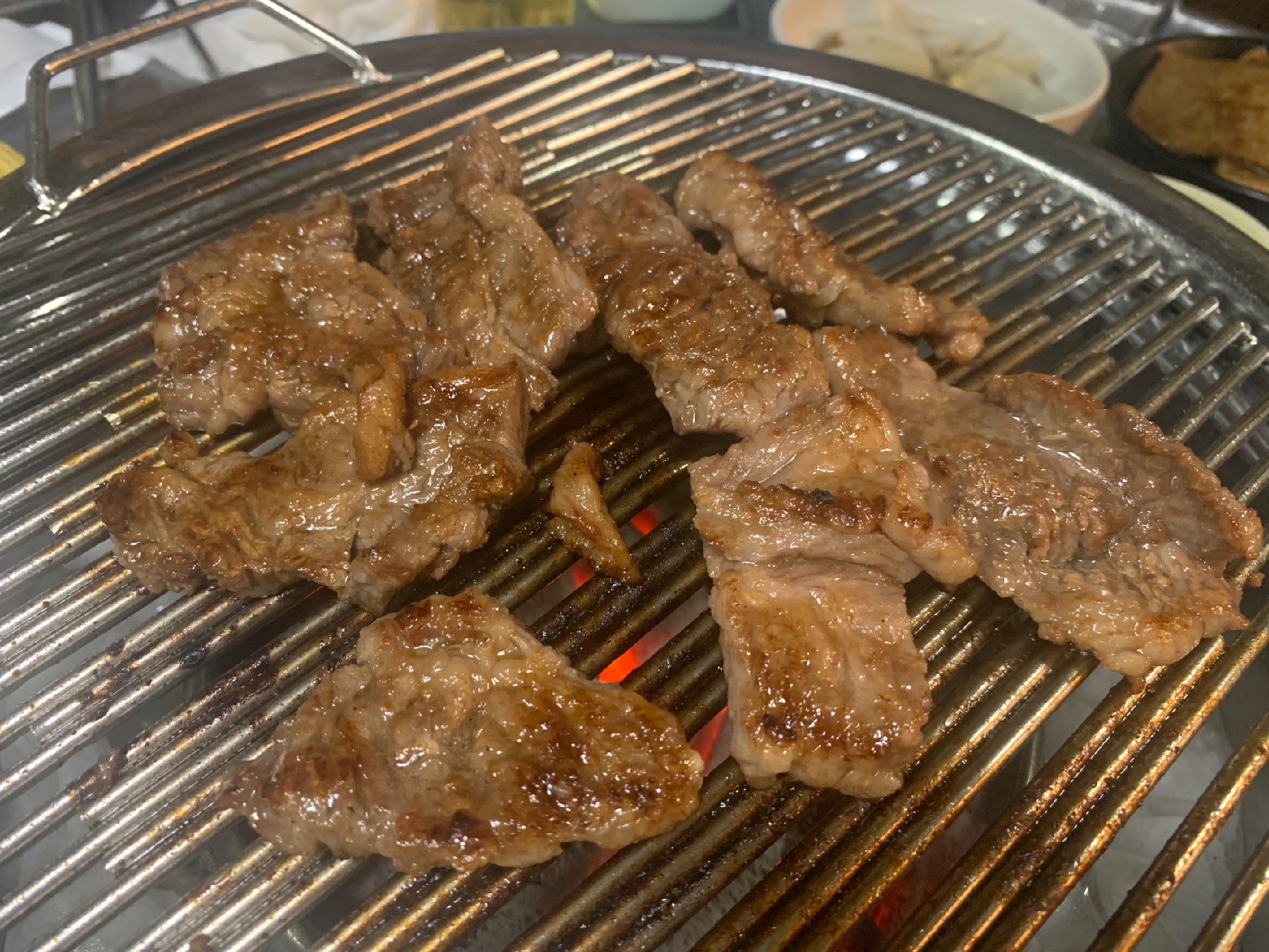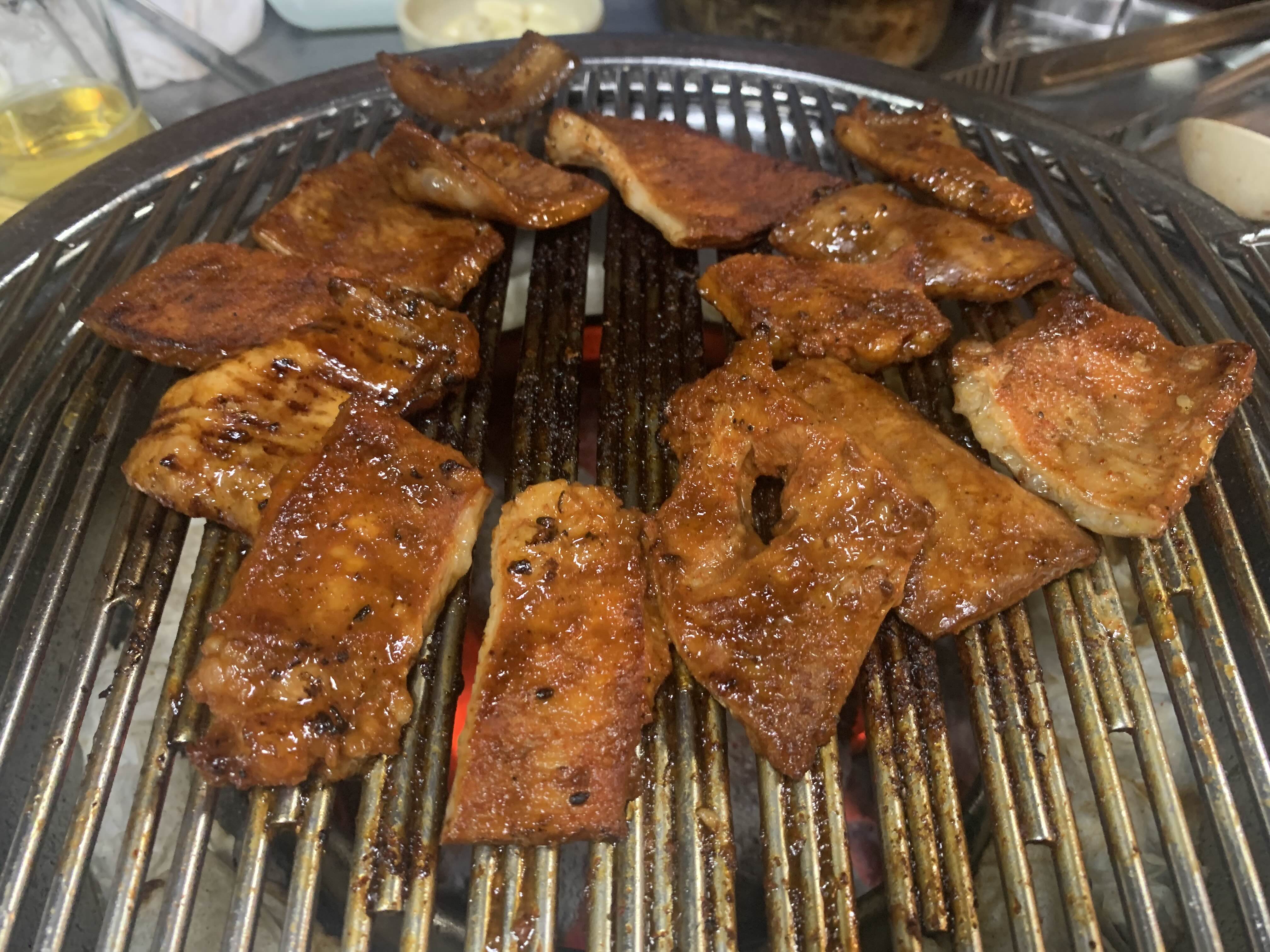 비주얼부터 압도적이에요. 일반 돼지갈비가 아니라 마치 일본 야끼니쿠 스타일처럼 큰 한 점 한 점 정성스럽게 양념되어 있습니다.